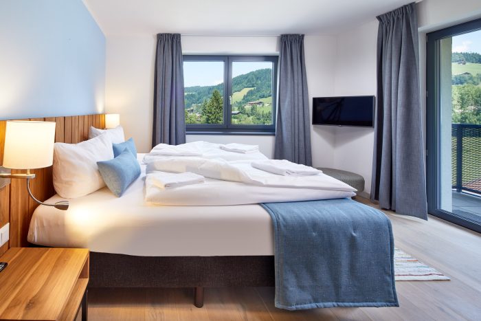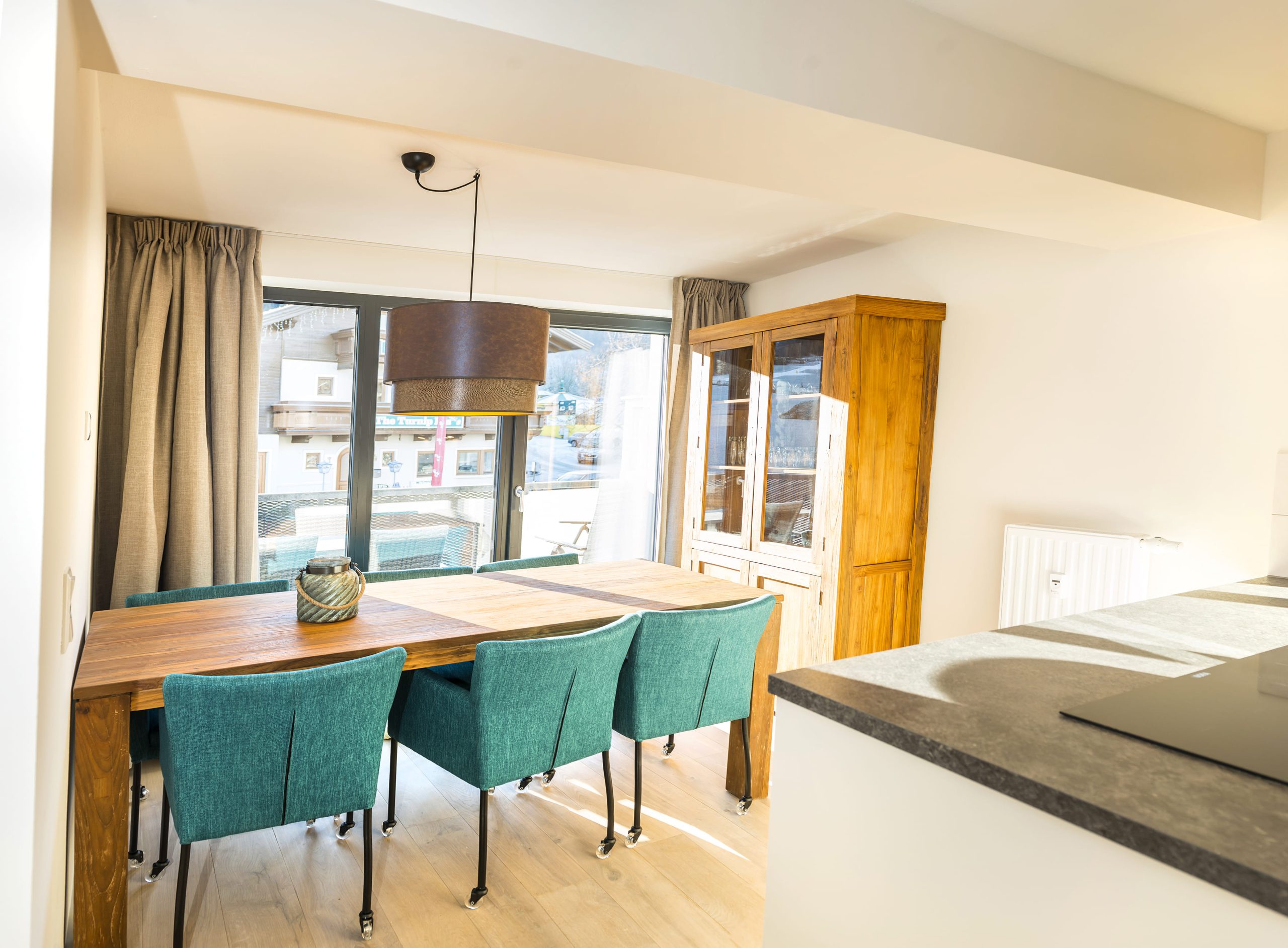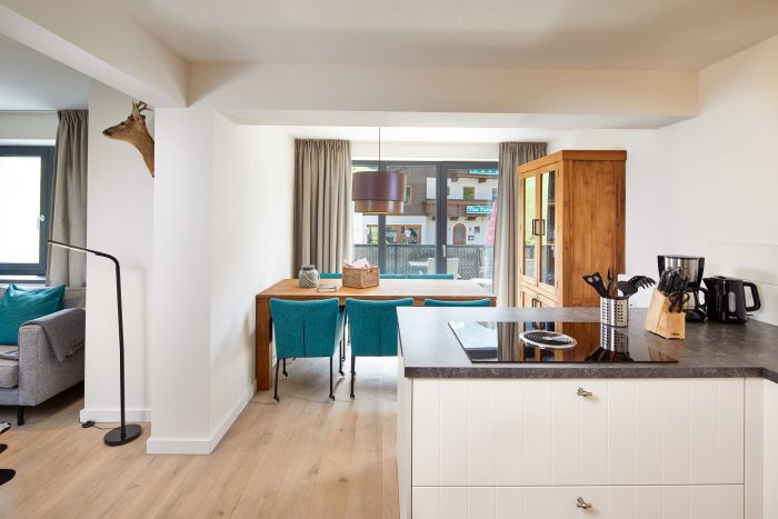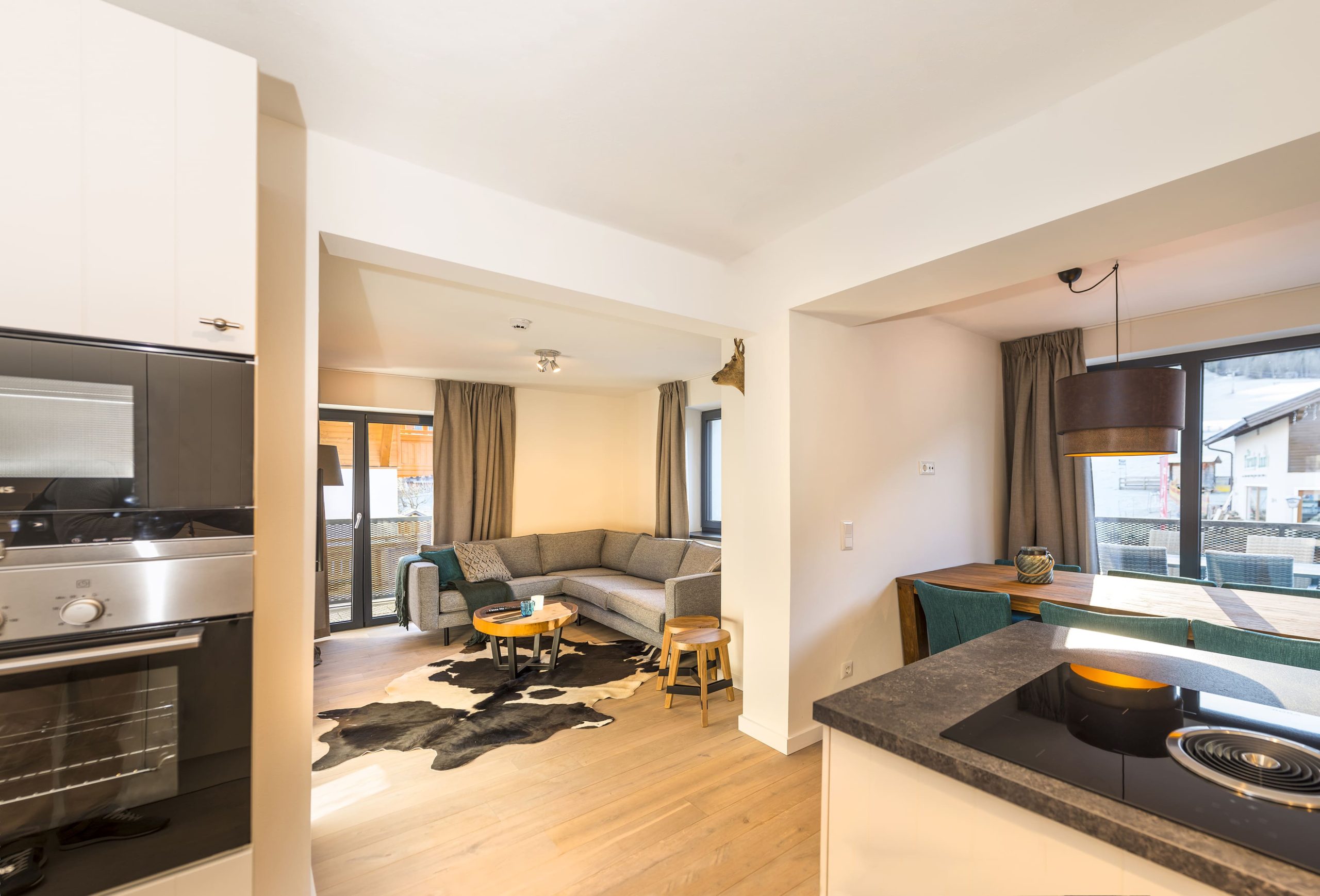 The spacious living room is bright and comfortably furnished with wooden floors and underfloor heating. French doors lead to the balcony and offer stunning views of the ski slopes and the center of Niederau.