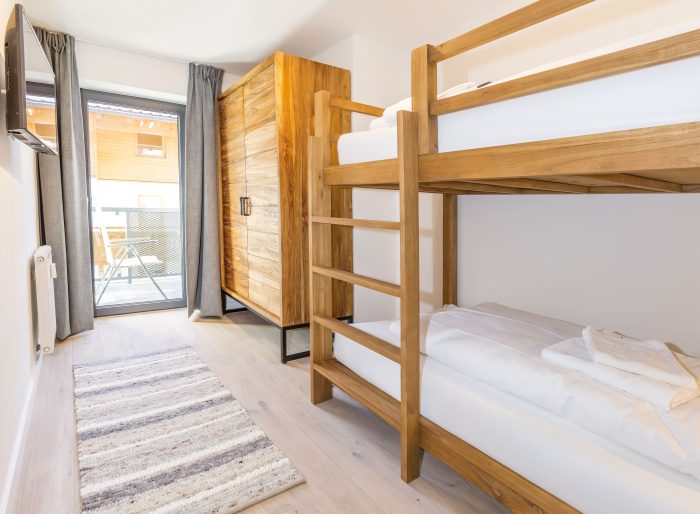 The apartment has three bedrooms: two with a double bed and one with a bunk bed. The rooms are stylishly finished and provide a comfortable place to relax.